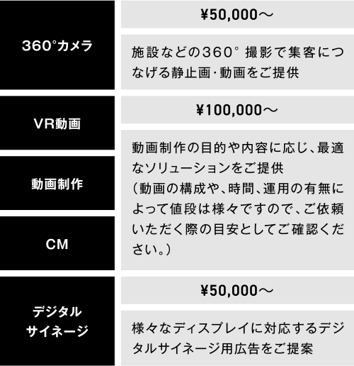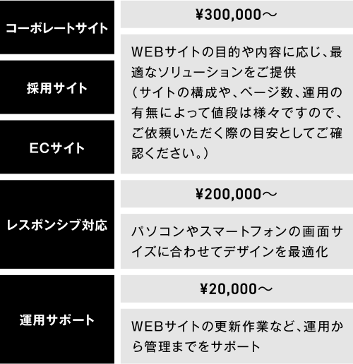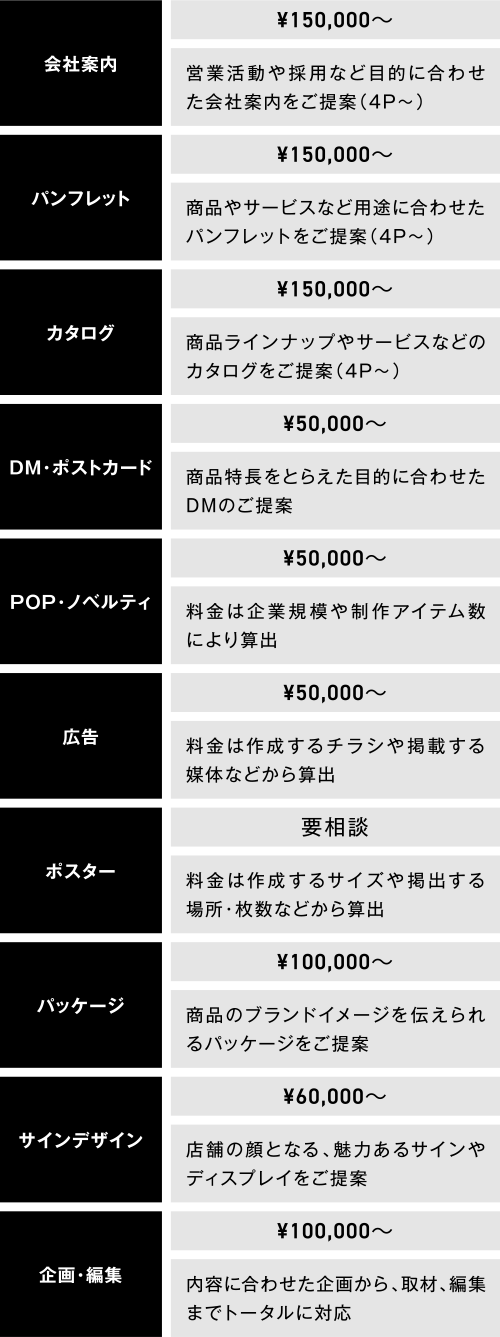 ※料金には、企画、ディレクション、デザイン費などが含まれます。詳細なお見積もりはご相談内容を元にご提出させていただきます。